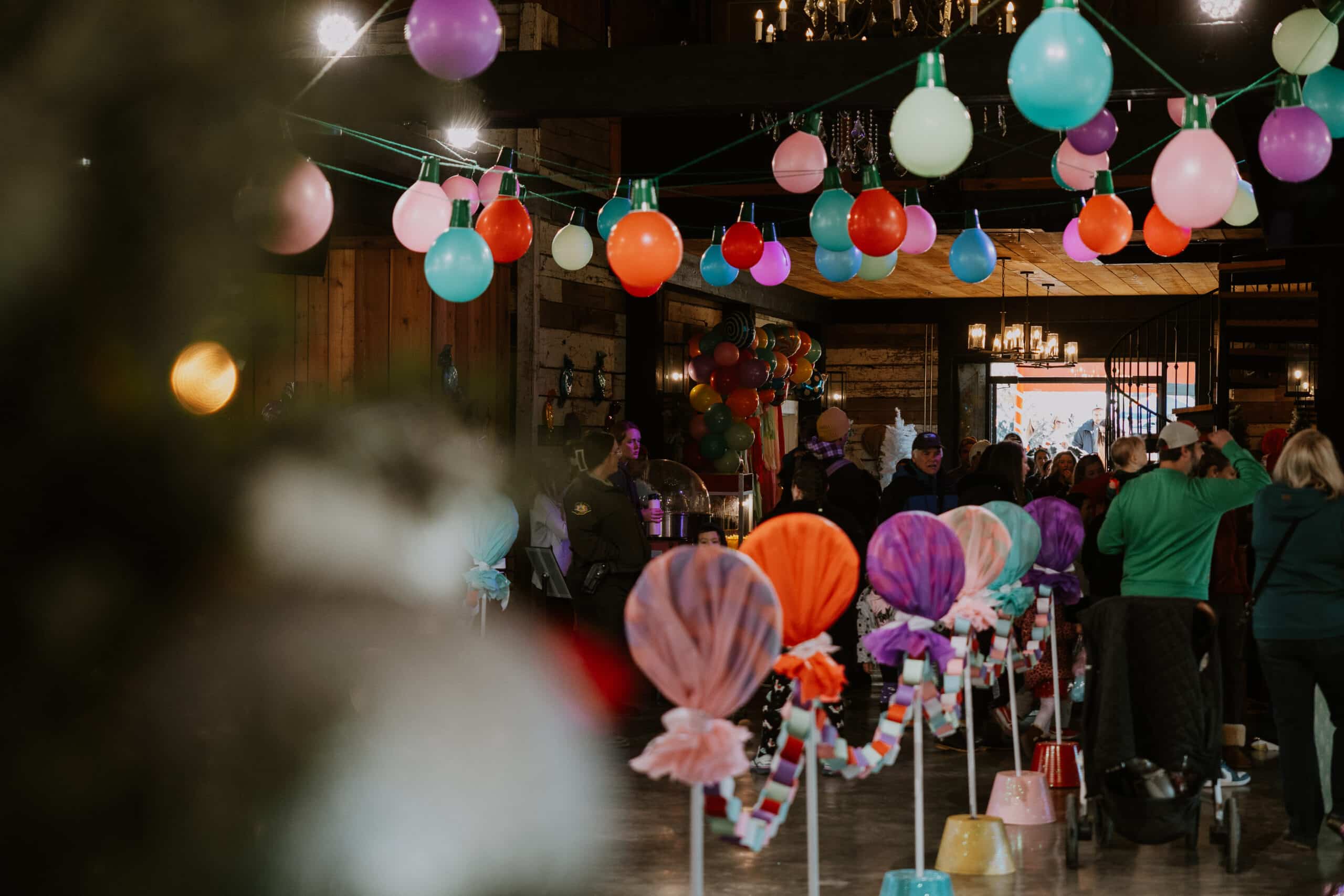 The rustic elegance of our Event Barn adorned with sparkling chandeliers.